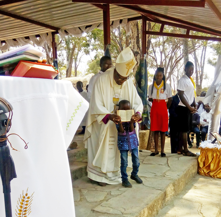 Après le chant d’entrée et les lectures de la Paroles de Dieu, c’est un tout jeune enfant qui a apporté l’Évangile à Monseigneur Zacarias Kamwenho et ils ont acclamé la Parole de Dieu ensemble.
