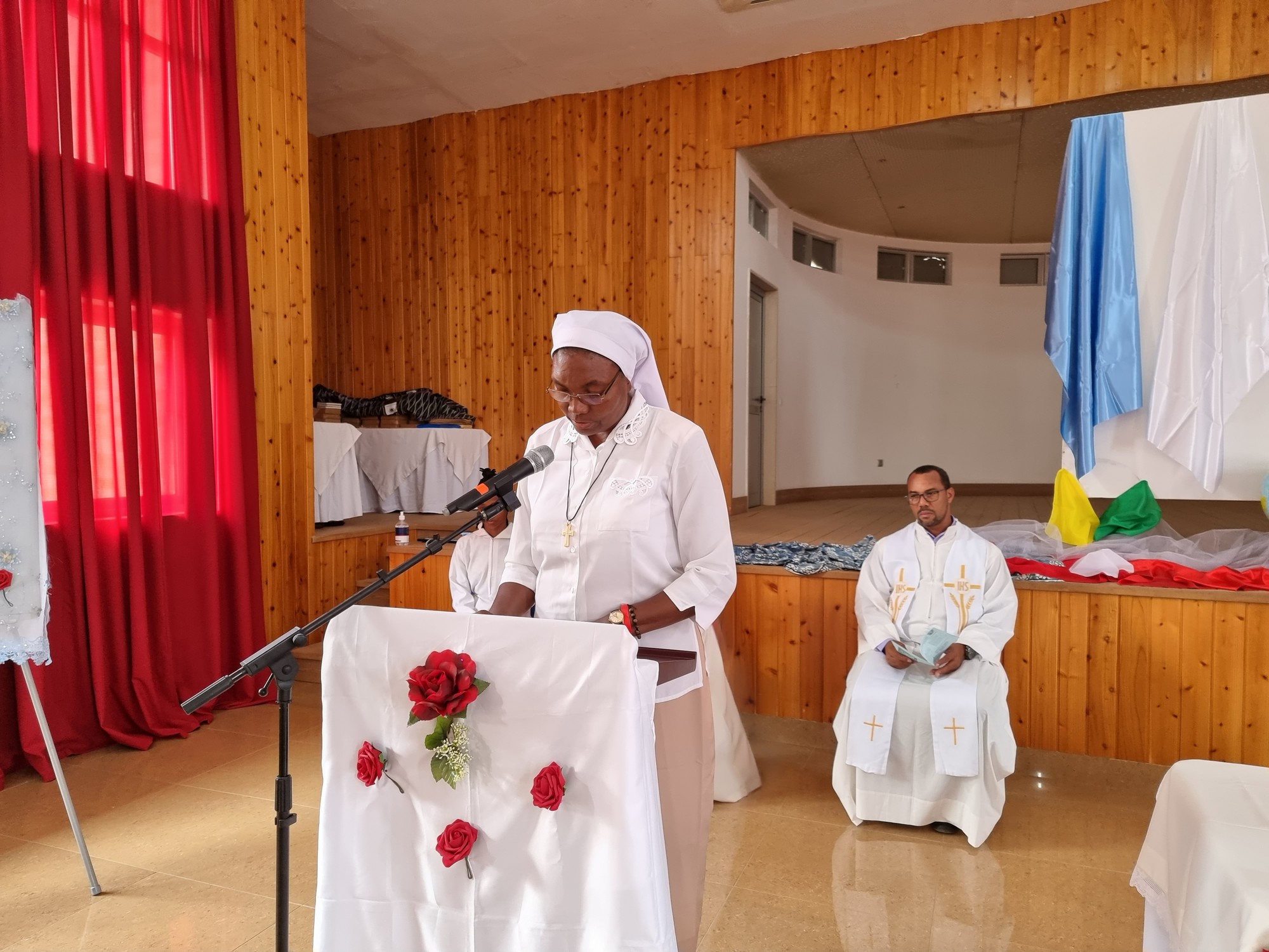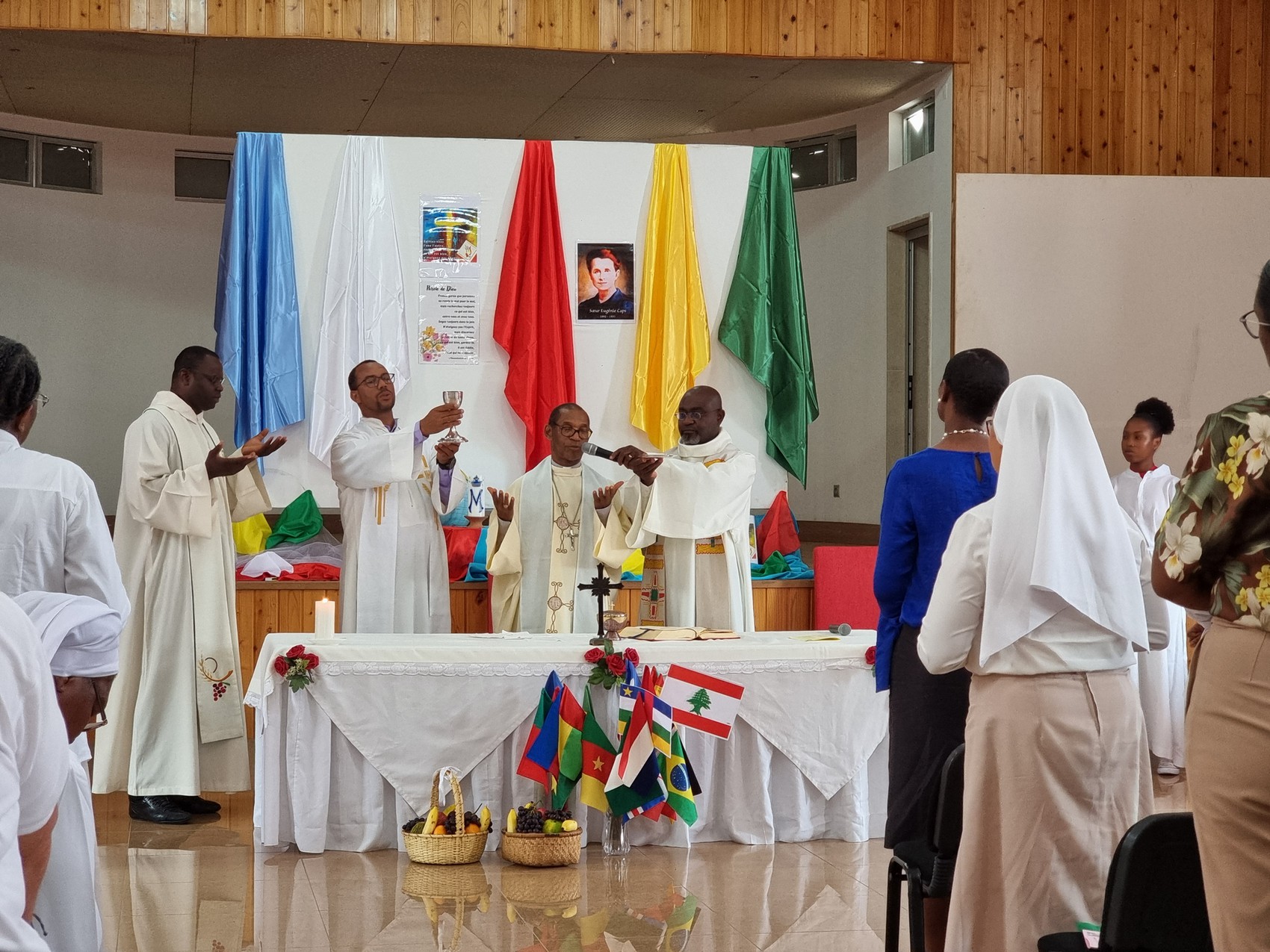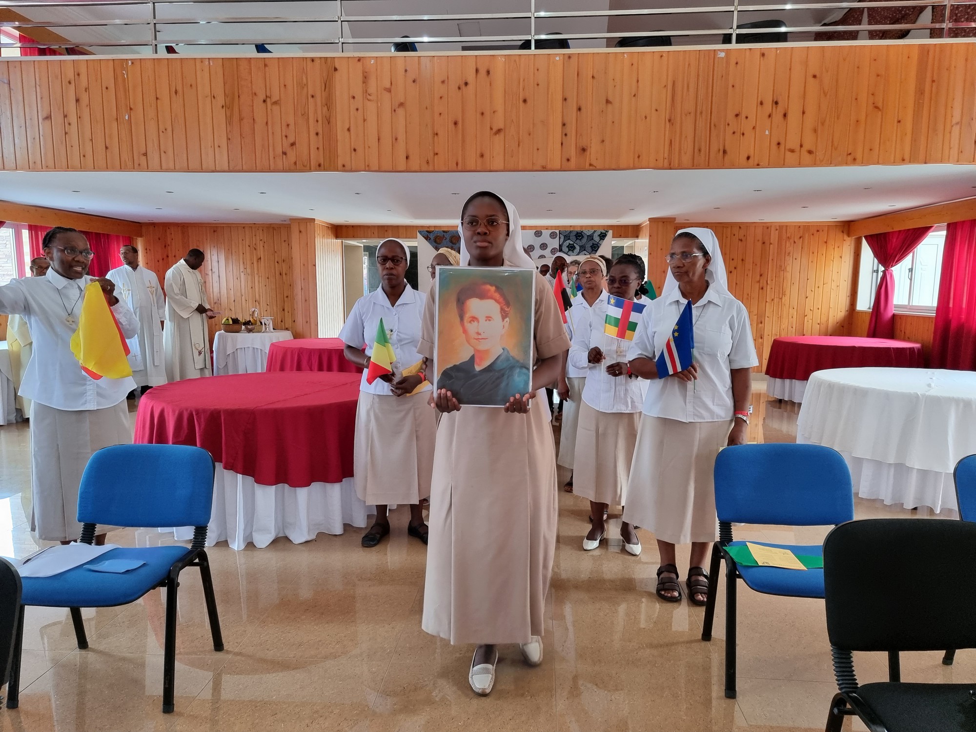 La messe commence par une procession d’entrée, animée par un chant en créole capverdien. Sœur Merveille Mialebama, Spiritaine, en mission au Cabo Verde, porte un portrait de Sœur Eugénie Caps, suivi du logo du CGE porté par Sœur Félicité Makuété, Spiritaine en mission en France. Puis suivent les Principales, portant chacune le drapeau de son District. Les drapeaux des pays dont sont originaires les Sœurs Spiritaines, mais où elles ne sont plus ou pas présentes, sont portés par les autres Sœurs participantes, tels que celui de l’Espagne par Soeur Maria José Arandia, le Paraguay par Soeur Laly Nieto, le Burkina Faso par Soeur Joséphine Nganji, le Liban par Soeur Nathalie Yadou, la Suisse par Soeur Vitorina Moreno, les Pays Bas par Soeur Marie-Bernadette Delpierre, et l’Allemagne par Sœur Anna Sabé.
