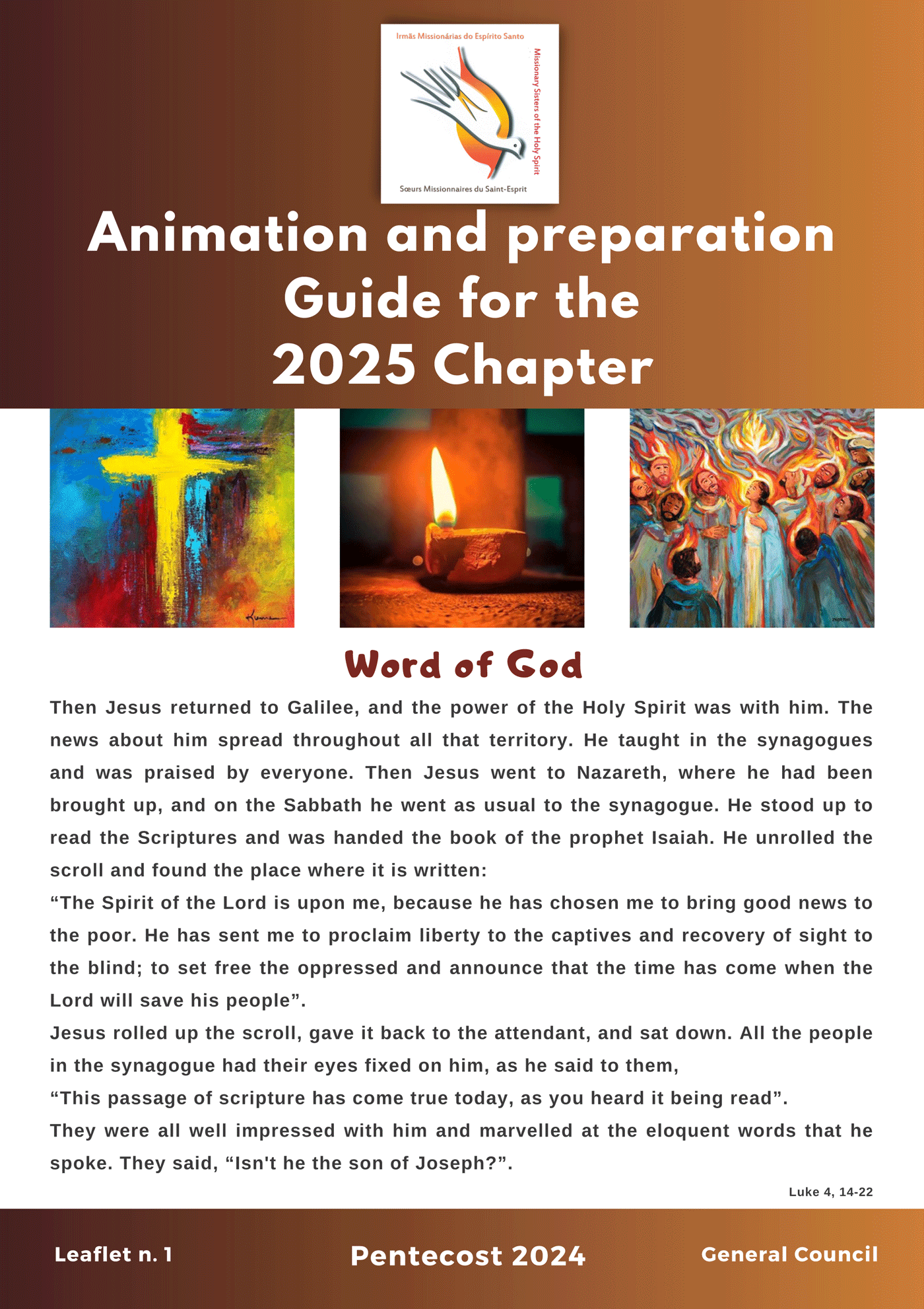 Of course, you have understood that I have paraphrased the text of the Acts of the Apostles, the account of the day of Pentecost, from our lives on mission, wherever each one has been sent, within the General Council and the Services of the Generalate. Indeed, how many times have we witnessed a light breeze or a sudden noise, occurring without prior appointment, this unexpected gust of wind that leads us into the Light and Strength of the Word. This is truly the grace of the Spirit in our lives. This day of Pentecost is revived in our midst, with the features of our faces, bearing the accounts of our human stories, and always with the same unshakable power of the Spirit.