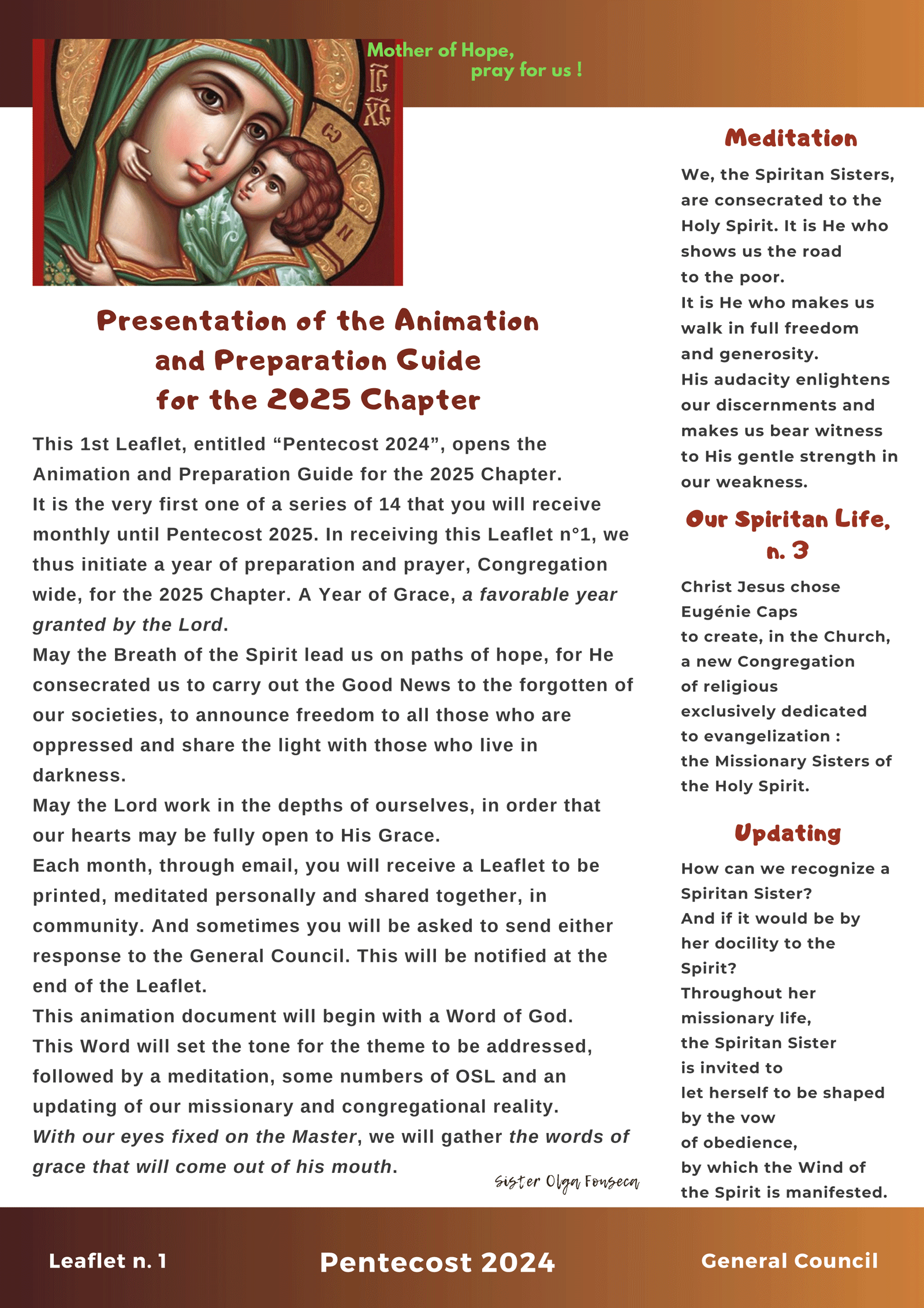 Let us listen to him, the Spirit is here. Let us listen to him, in the words filled with hope that our dear Foundress has left us, a spiritual heritage for each one of us: « Holy Spirit, enlighten us so that I may do the most holy will of the Heavenly Father. May the work be done as God wills it! It has begun, you will bring everything to a successful conclusion ». Cf. Journal of Sister Eugénie Caps, on January 15, 1921.