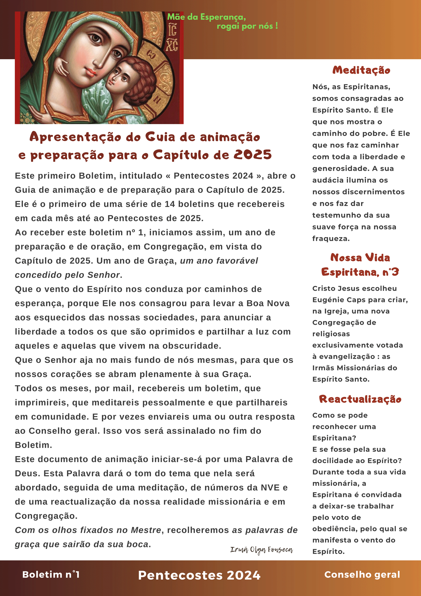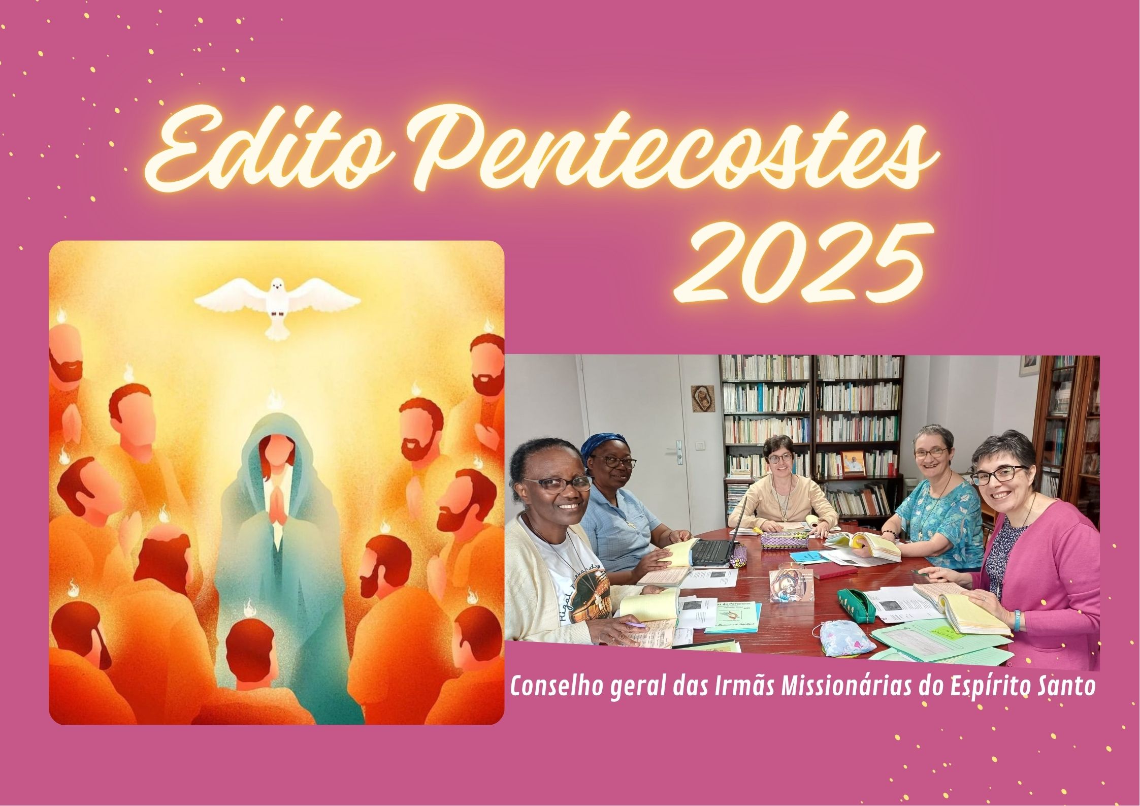A cada uma de vós, com todo o Conselho geral, desejo-vos um magnífico Pentecostes de 2025 e que as graças do Espírito repousem mais profundamente em vós, nas vossas famílias e nas nossas comunidades à imagem de um selo indelével.