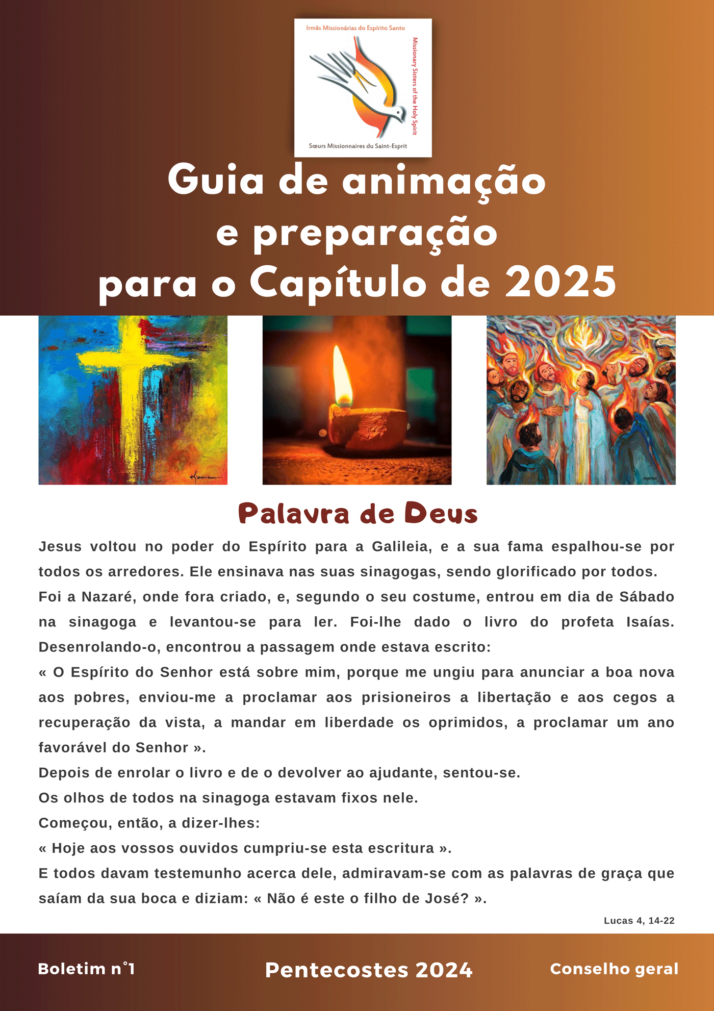 Eis-nos nas vésperas do nosso 16º Capítulo geral. O nosso ano de preparação e de oração pelo Capítulo termina com a celebração do Pentecostes. Recebido cada mês, o Guia de animação ajudou-nos, através da palavra das Bem-aventuranças em Mateus 5, 1-16, a encontrar mais o Jesus da Boa Nova. Jesus em atitude de anúncio como Jesus no pobre e na alegria da partilha. Este Guia mensal permitia-nos partilhar, primeiro entre nós, a nossa fé. Levava-nos a caminhar não só na confiança, mas também na suave docilidade ao Espírito. Colocava-nos no caminho da justiça e da paz, duas irmãs inseparáveis. O Guia fazia-nos meditar mais sobre a autoridade ao serviço da comunhão na Congregação, tomando uma atitude de escuta ao apelo da audácia do Evangelho. Este Guia convidava-nos também a olhar as nossas Idosas como tecelãs de paz, a deixar agir em nós a força do Evangelho e a renovar o verdadeiro zelo do apóstolo. É nesta atitude de profeta que a nossa vida espiritana se torna grão de sal, espalhando o perfume do bem. Bem que ilumina e cheira bem.